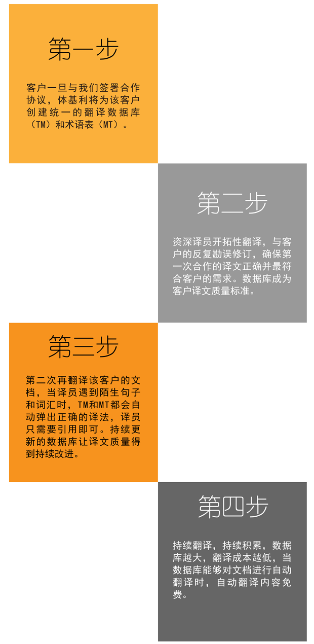 客戶一旦與我們簽署合作協(xié)議,體基利將為該客戶創(chuàng)建統(tǒng)一的翻譯數(shù)據(jù)庫(TM)和術(shù)語表(MT)。